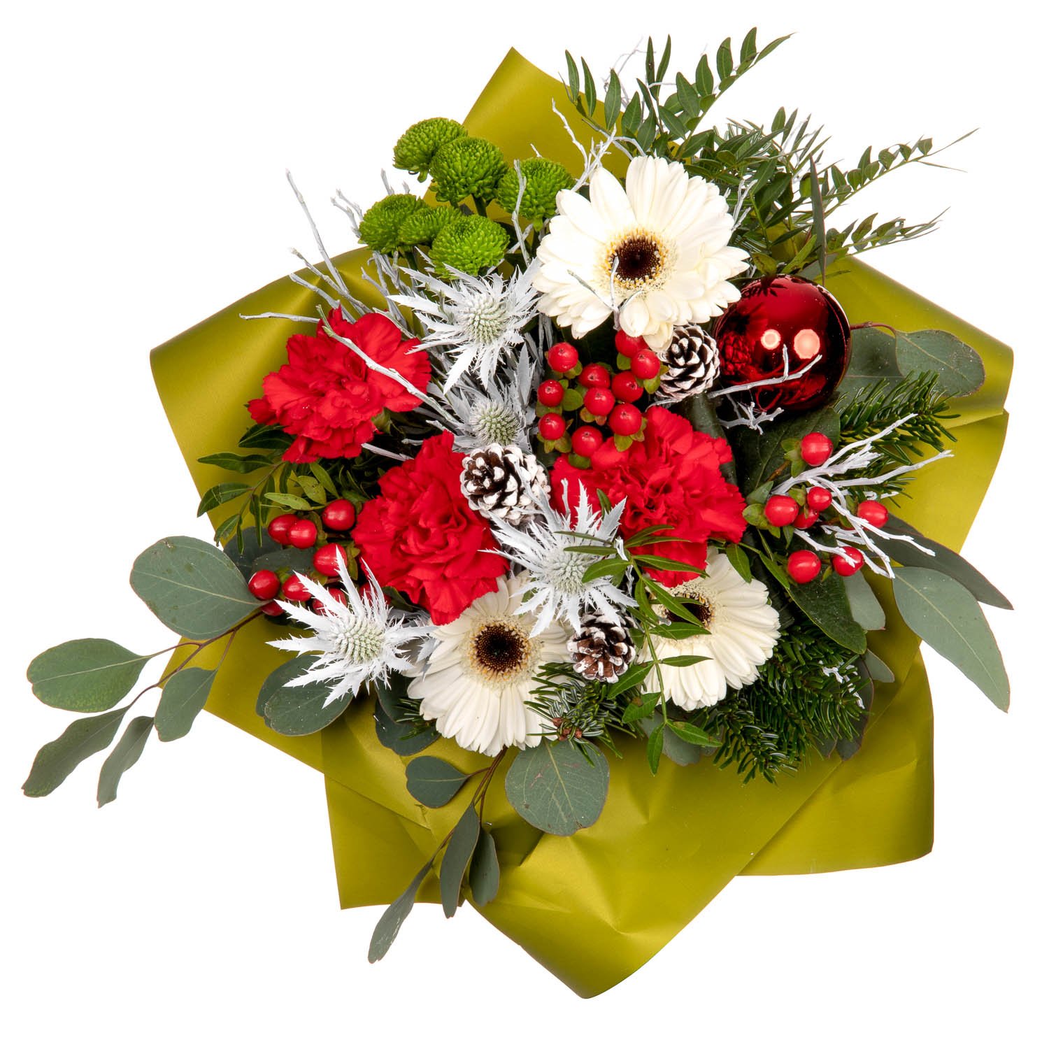 Carnations, Mini Gerberas, Santini Chrysanthemums, Eryngos, Hypericum, Sleeve & Decorative greenery (11 stems)